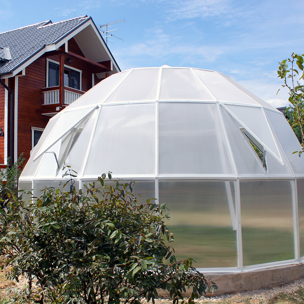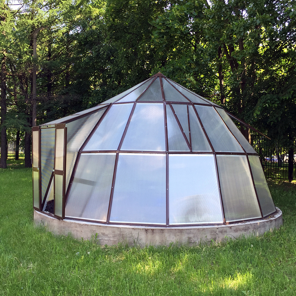 Нестандартная красивая и сверхпрочная конструкция с покрытием из сотового поликарбоната CARBOGLASS, толщиной до 10 мм, которая станет объектом повышенного внимания на любом приусадебном участке. Отлично подходит для создания зимнего сада и выращивания в нем цветов и небольших деревьев. Оранжерею можно без проблем использовать, как обычную теплицу для овощей, фруктов или зелени.