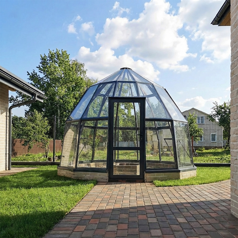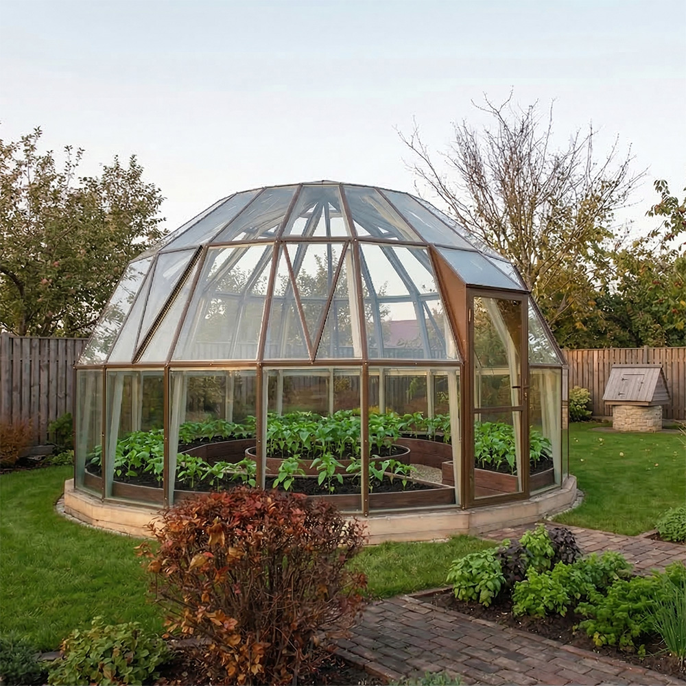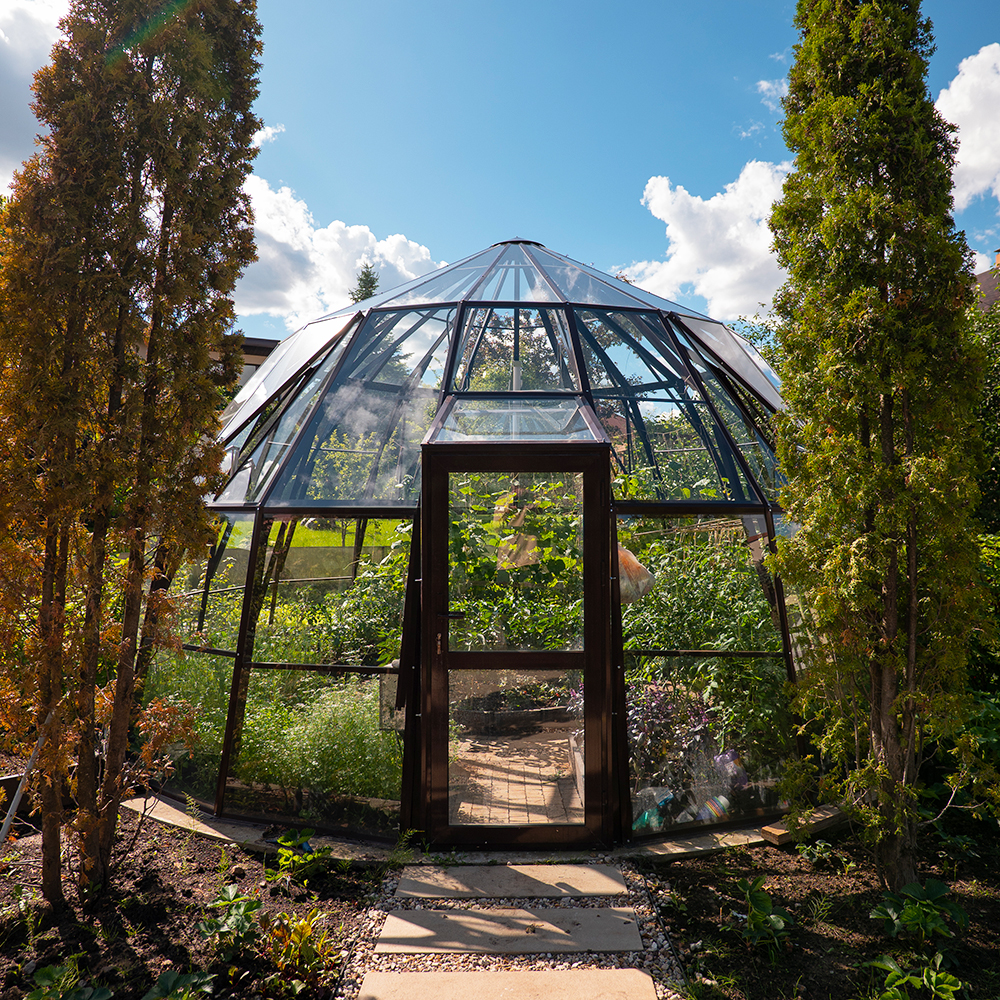 Конструкция оранжереи, имеющая купольную форму, выполнена из множества секций, расположение и углы наклона которых продуманы с точки зрения быстрого самоочищения поверхности от снега. В итоге, большая снежная шапка не скапливается при обычных снегопадах. Конструкция способна выдерживать порывы ветра до 30 м/с и снеговую нагрузку до 300 кг/м². Для усиления прочности и защиты от теплопотерь, толщина стекла М1 CLEAR FLOAT, используемого в качестве покрытия, может достигать 8 мм.