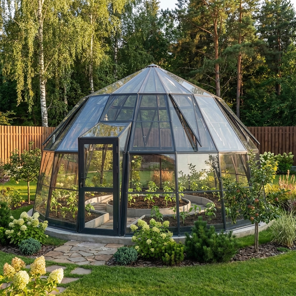В процессе заказа оранжереи, вы можете выбрать необходимый диаметр, в пределах от 2.5 до 6 метров, от которого будет зависеть высота конструкции, необходимое количество вентиляционных форточек, а также двери — комплект раздвижных «купе» или распашная из алюминия. Возможен также выбор предпочтительного цветового решения для стальных элементов каркаса с использованием метода полимерно-порошковой окраски.