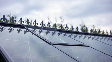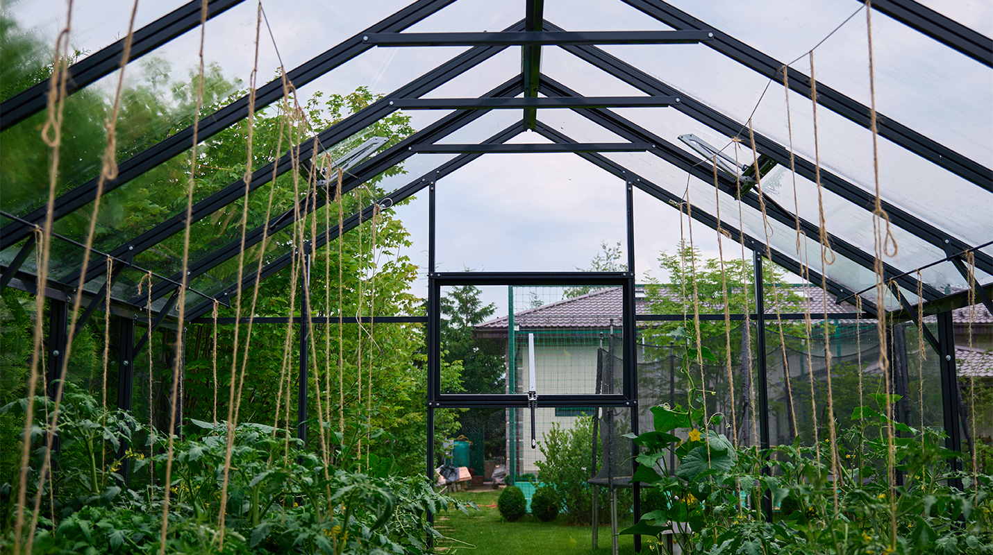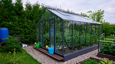 Чёткая геометрия подчёркивает строгий и собранный характер конструкции. Теплица формирует выразительный акцент на участке, сочетая архитектурную сдержанность с ощущением надёжности и продуманного пространства.