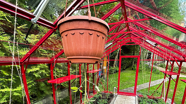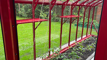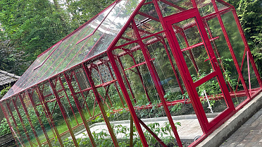 Теплица БИОНИКА Классик – яркая архитектурная доминанта участка, проект для ведущей телевидения Первого канала. Насыщенный цвет задаёт характер пространства, подчёркивая геометрию и делая теплицу выразительным акцентом в окружении.