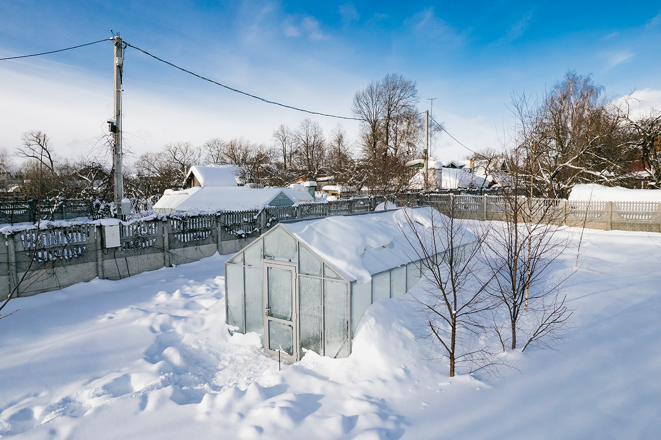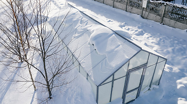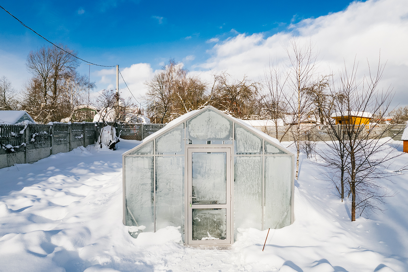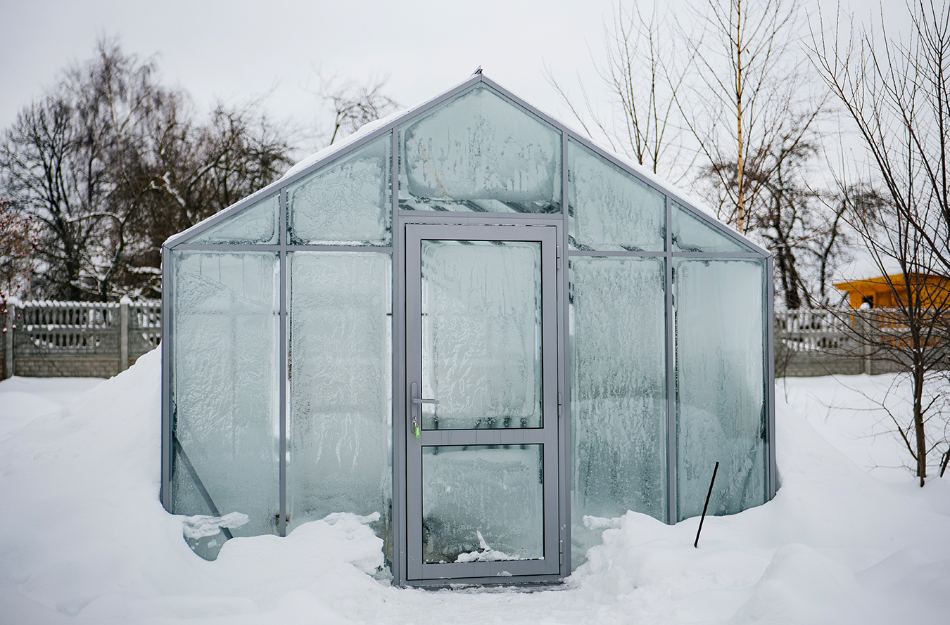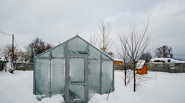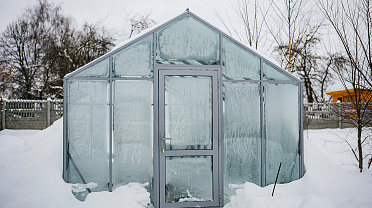 Сдержанное цветовое решение с акцентом на архитектуру и чистоту линий. Глубокий серый оттенок подчёркивает геометрию формы, а в зимний период теплица сохраняет уверенную устойчивость к снеговым нагрузкам, оставаясь выразительным элементом участка.