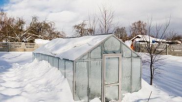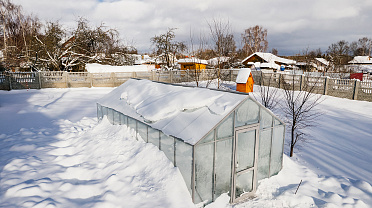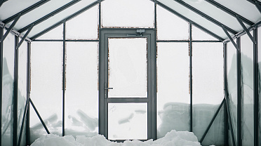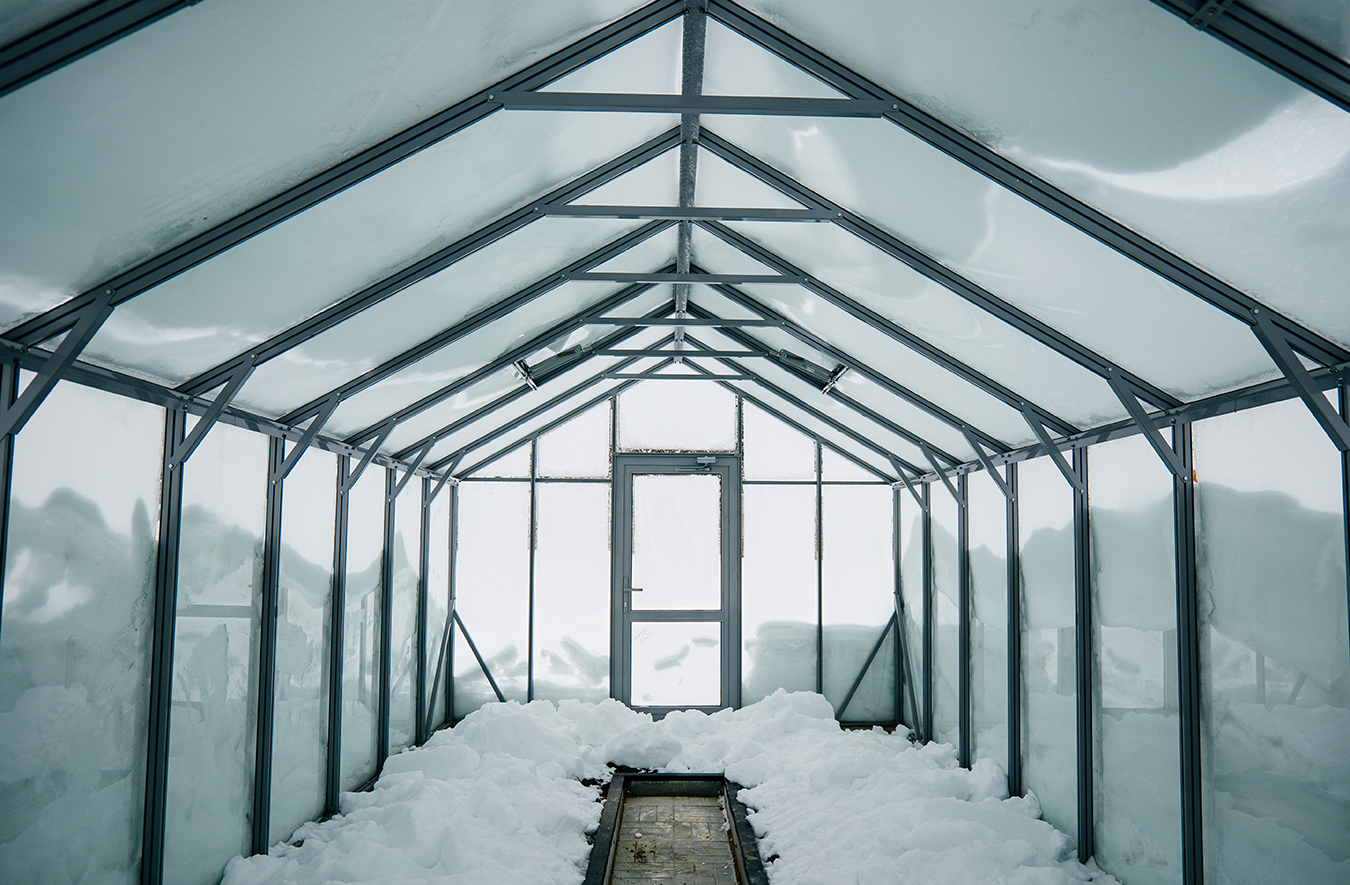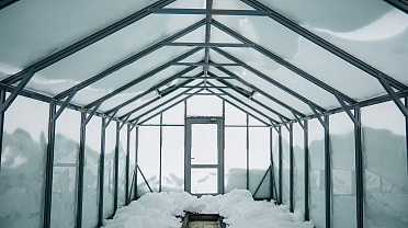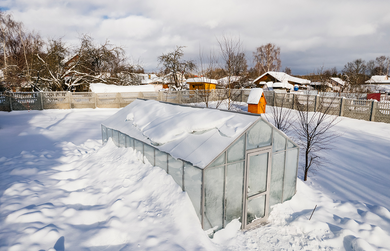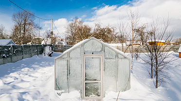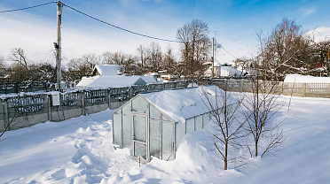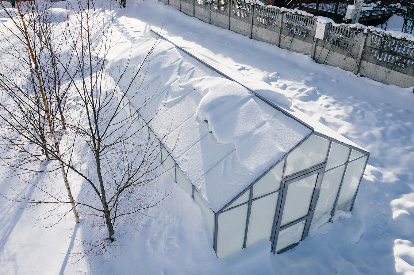 Сдержанное цветовое решение с акцентом на архитектуру и чистоту линий. Глубокий серый оттенок подчёркивает геометрию формы, а в зимний период теплица сохраняет уверенную устойчивость к снеговым нагрузкам, оставаясь выразительным элементом участка.