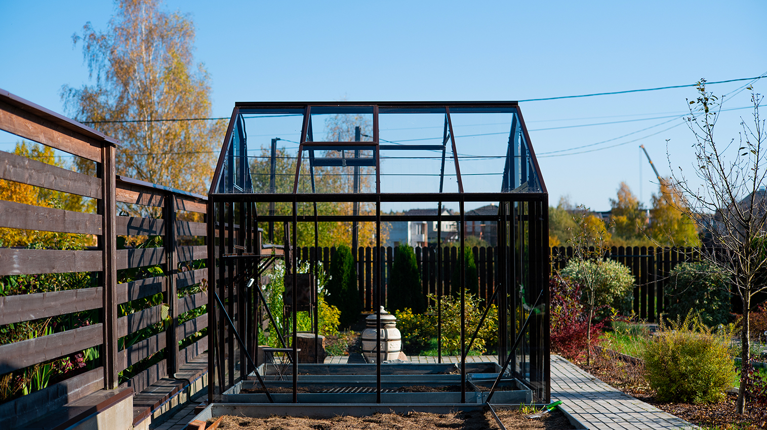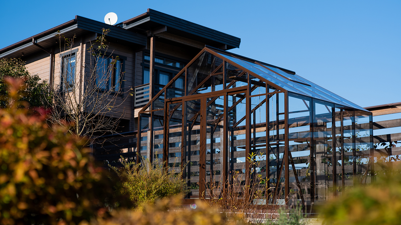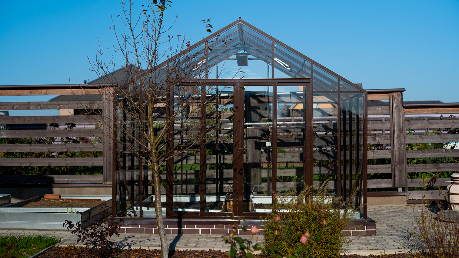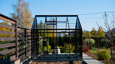 Тёплый коричневый оттенок формирует более мягкое и уютное восприятие, органично связывая теплицу с ландшафтом. Сдержанная архитектура и чистые линии создают аккуратный акцент на участке, сохраняя баланс между выразительностью и естественностью.