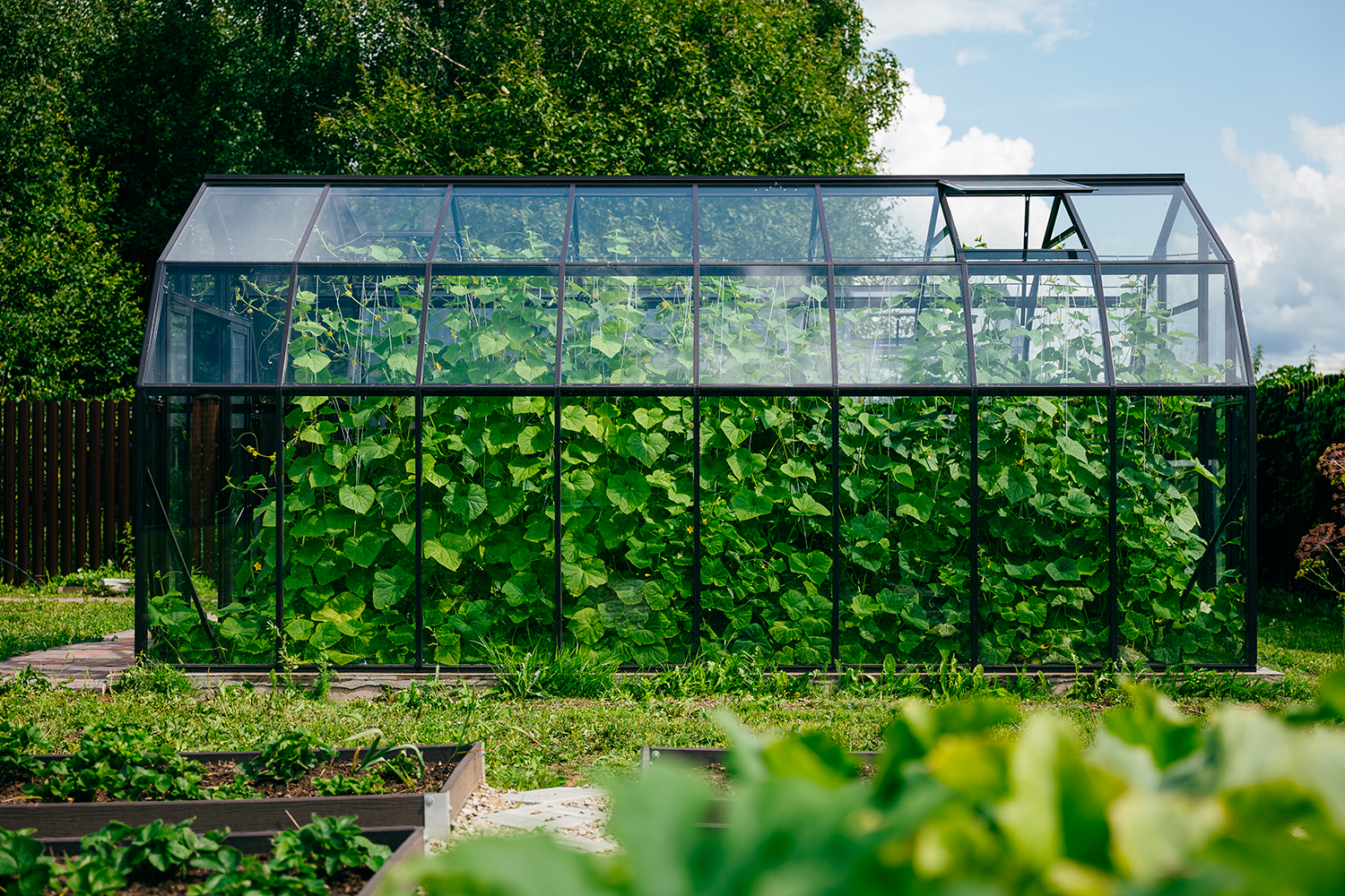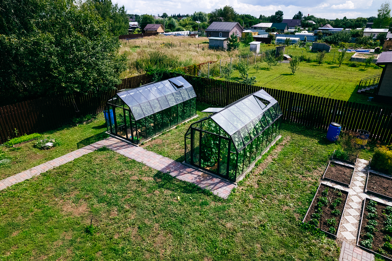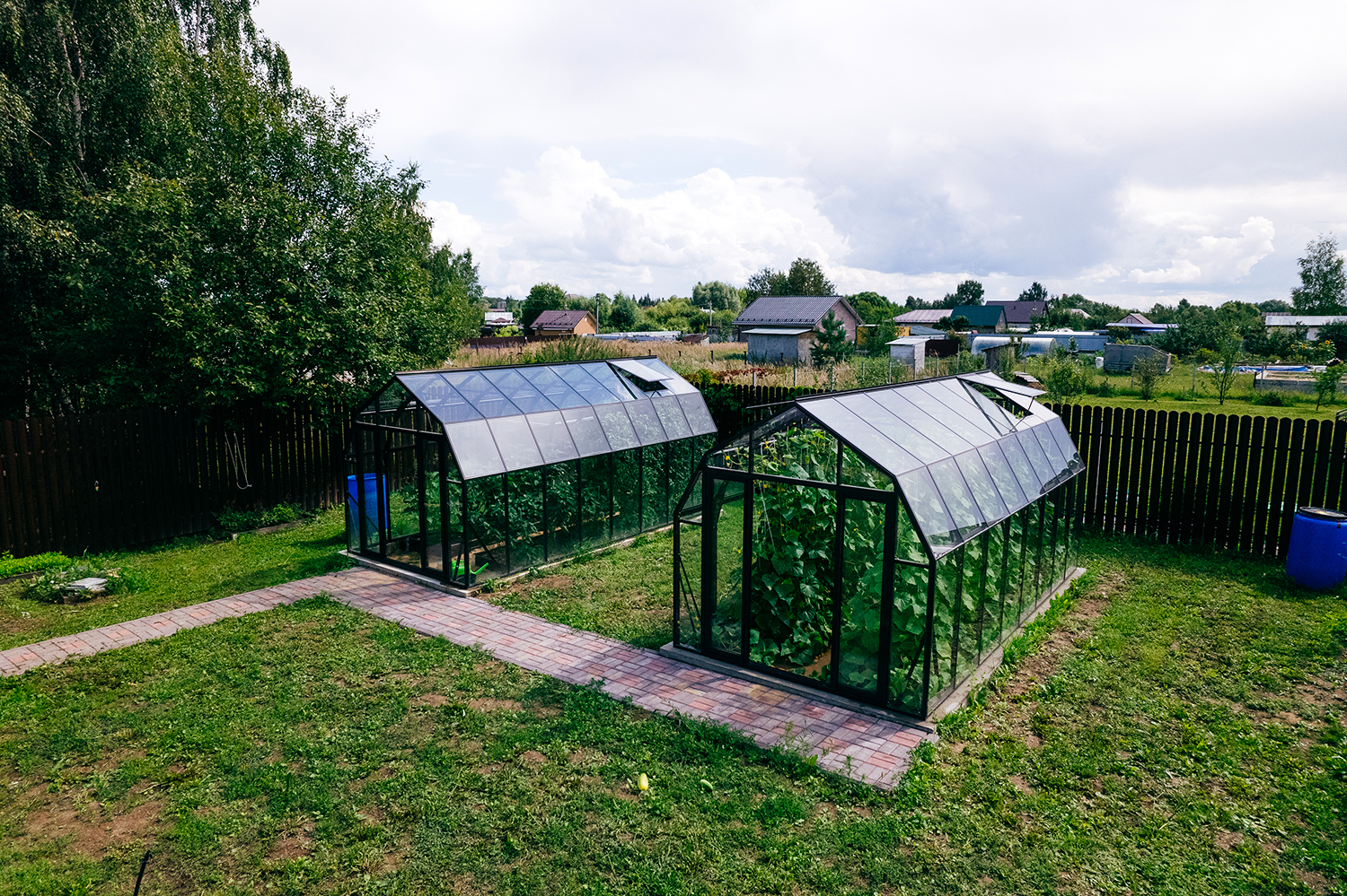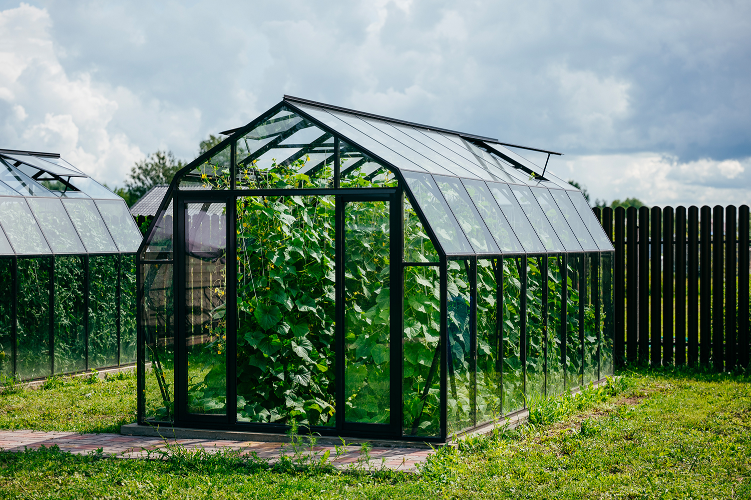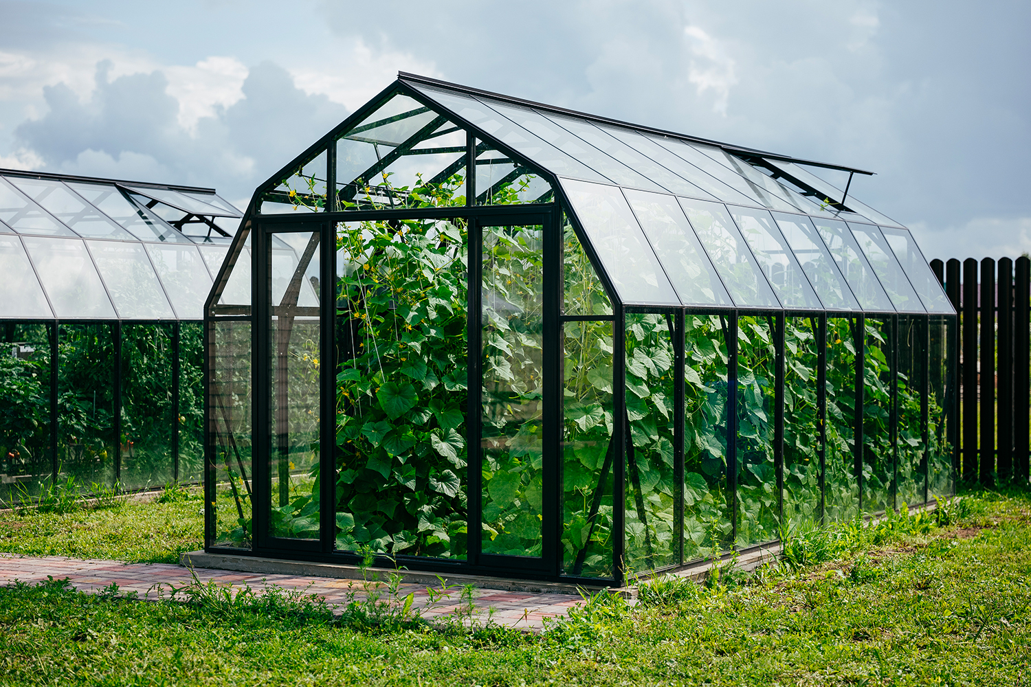 Две теплицы КРИСТАЛИКА Классик – выверенная архитектура и уверенная конструкция. Чёткая геометрия формирует гармоничную композицию на участке, а продуманное решение обеспечивает стабильность и надёжность в эксплуатации.